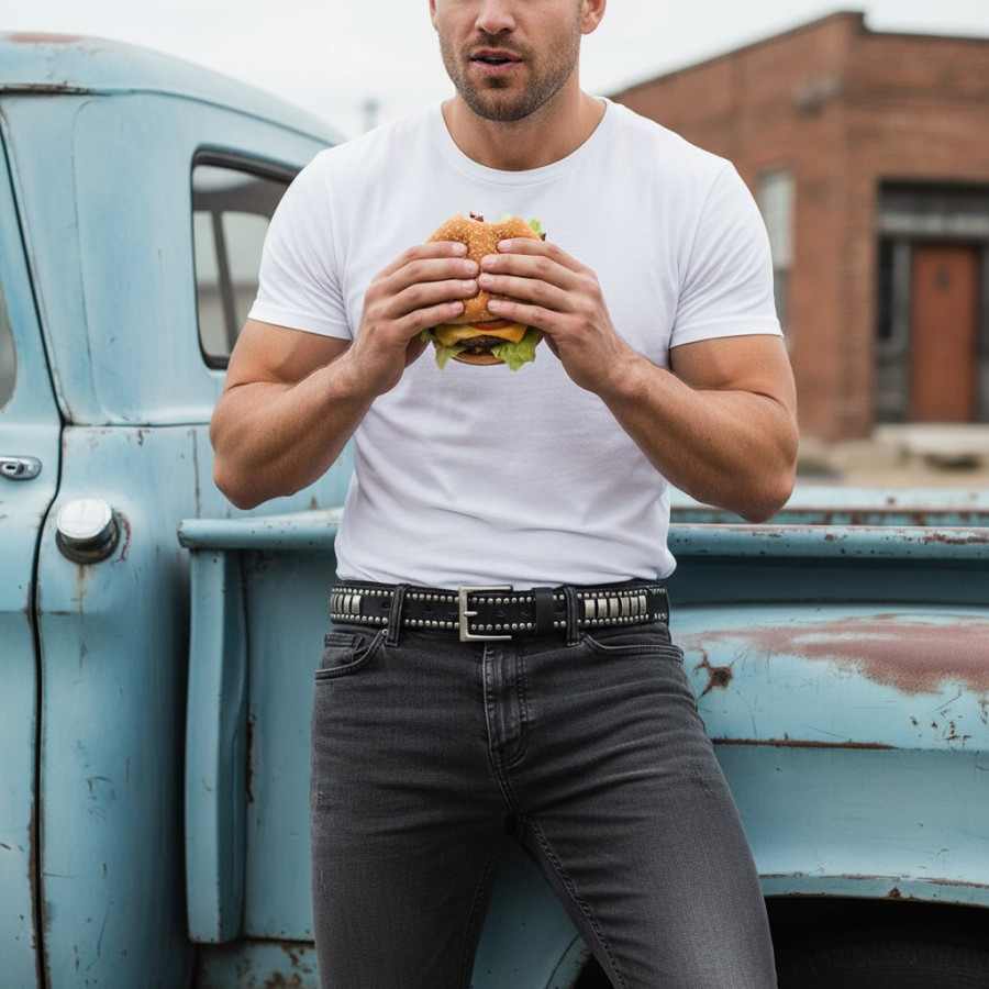 Mens Studded Belt for Jeans Black. Rock-inspired studded belt with rectangular rivets.